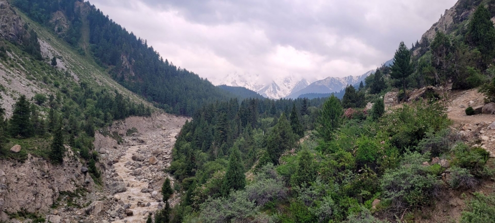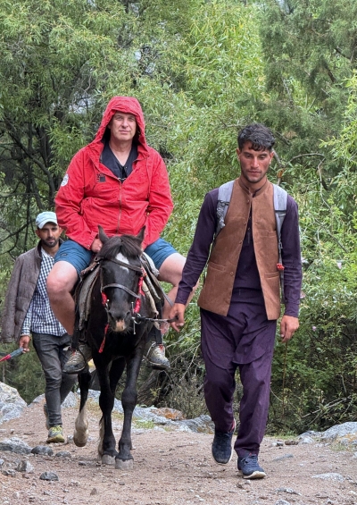A keskeny, ember szélességű ösvény nem volt túl bizalomgerjesztő. Különösen nem az olykor-olykor megbotló imbolygó paripa hátán ülve. A vezetőszárat tartó fiú kellő határozottsággal „húzta” kis barátomat, és mivel előttem lépdelt, nem láthatta csendes küzdelmemet. Egy-egy nagyobb kilengésnél kétségbeesetten kapaszkodtam a nyereg elülső kápájába, miközben igyekeztem kiszámítani a ló következő mozdulatát, és az oldalsó mozgásoknak kellő időben ellentartani. Alig fél méterrel kijjebb meredek, szakadékos hegyoldal húzódott, az alattunk kígyózó Rakhiot-folyó pedig úgy 4-500 méterre lehetett. A Nanga Parbat hasonló nevű gleccseréből táplálkozó vízfolyás vad zúgóit idefent is jól hallhattuk. A kellemesen frissítő szellő halk fuvallata, a kabátomon kopogó csendes eső és szegény párák fújtatása mellett leginkább ez szolgáltatta a háttérzenét.