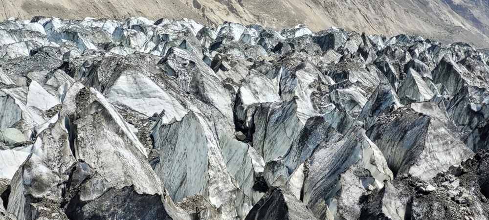 Jó száz méterrel lejjebb és bő fél órával később, léphettünk rá a gleccser peremére. A Nap továbbra is égetett, de a „hűtőkamra” ajtaja immáron kinyílt alattunk. A hőmérséklet kellemesre mérséklődött, s ez már önmagában is elégtételt jelentett. Az arányok bizony alaposan megváltoztak. A platóról látott göröngyös felszín idelent egymásra torlódott, piramisokat képező jégtornyok kaotikus összevisszaságát tükrözte. Alattunk félelmetes, beláthatatlan hasadékok tátongtak, nem mindennapi perspektívát kínálva egy „hangyává” zsugorodott ember szemszögéből.