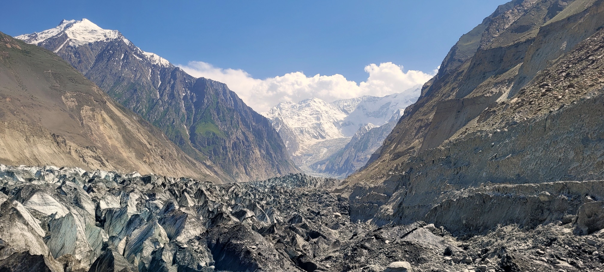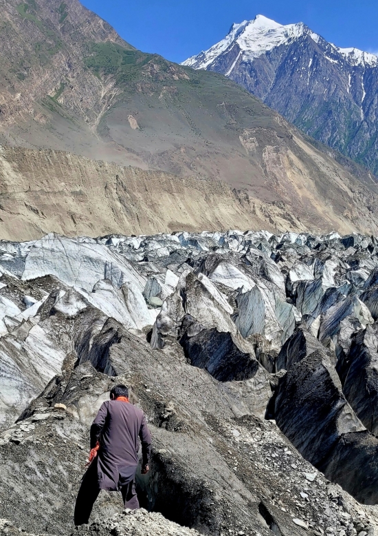 A sziklaplatóra érve, majd onnan letekintve tátott szájjal bámultuk az alattunk futó hatalmas jégárat, magát a Hopper-gleccsert. Korábban is jártam már gleccsernél – két napja jöttünk le a Nanga Parbat alaptáborából, előző évben Grönlandon, korábban Norvégiában és az Alpokban, azonban magashegyi gleccserre eddig még nem merészkedtem. Végre ez az alkalom is eljött, így nem lehetett kérdés a leereszkedés sem. Két társam és pakisztáni vezetőink „offolták” a témát, mondván nekik ehhez most nincs kedvük, meg egyébként is most ették tele magukat. Kísérőink talán nem először vannak itt, így ők most beérik ezzel a látvánnyal is.